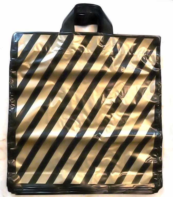 Szalagfüles polietilén táska. Vastag, fényes anyagból készült, így elegáns megjelenésű.