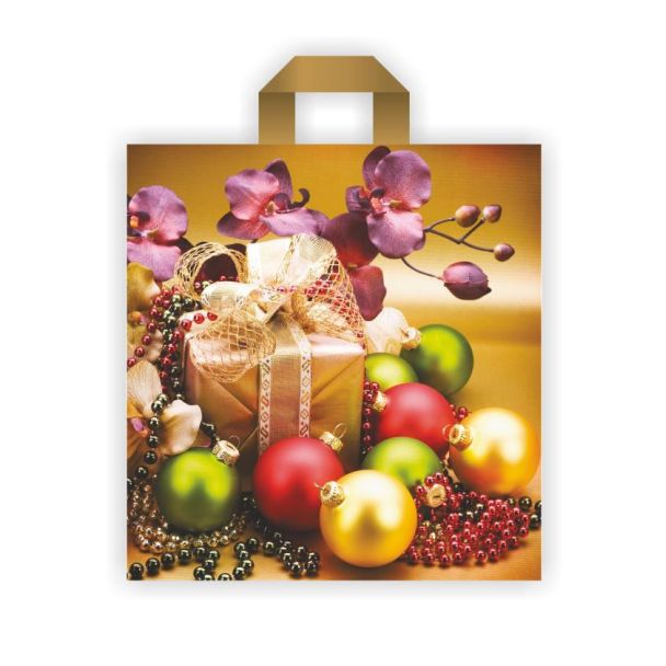 Szalagfüles polietilén táska. Vastag, fényes anyagból készült, elegáns megjelenésű, karácsonyi mintával.