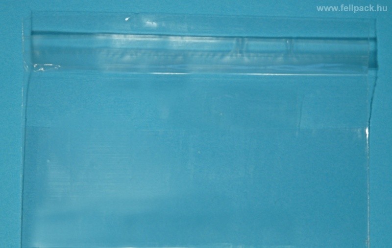 Átlátszó, színtelen PP (celofánszerű) tasak ragasztócsíkkal.
