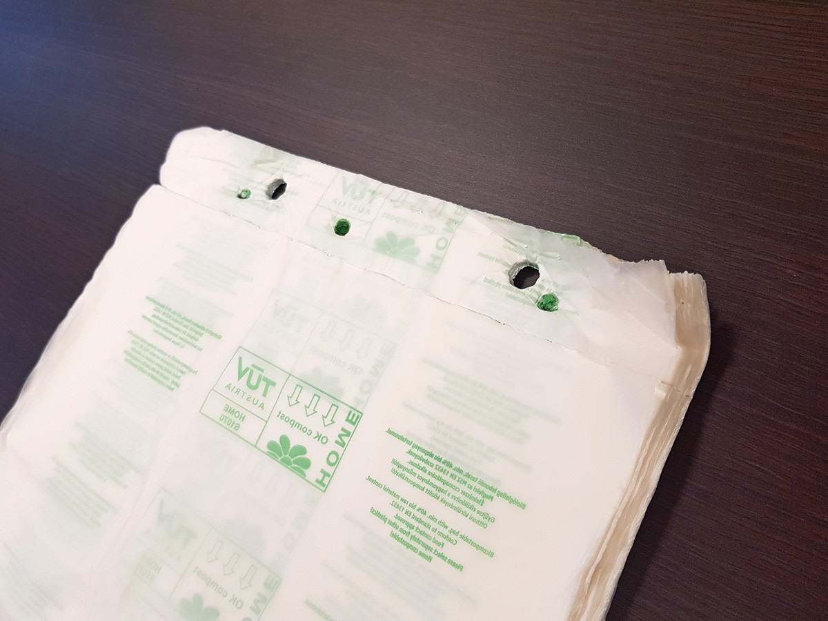 Megújuló forrásból származó, kukoricakeményítő alapú letéphető tasak.
