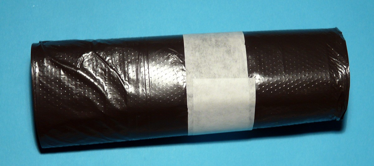 Polietilén zsák rolnizva. Környezetbarát, mert újrahasznosított anyagot tartalmaz.