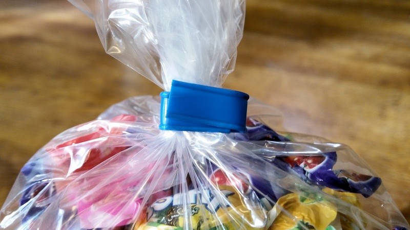 Műanyag kapocs a tasakok, zacskók gyors lezárására. Meg van hajítva, így csupán egy mozdulat a felhelyezése. A leragasztással szemben az előnye az, hogy a kibontás után a zacskóra visszahelyezve újra lezárható a termék.