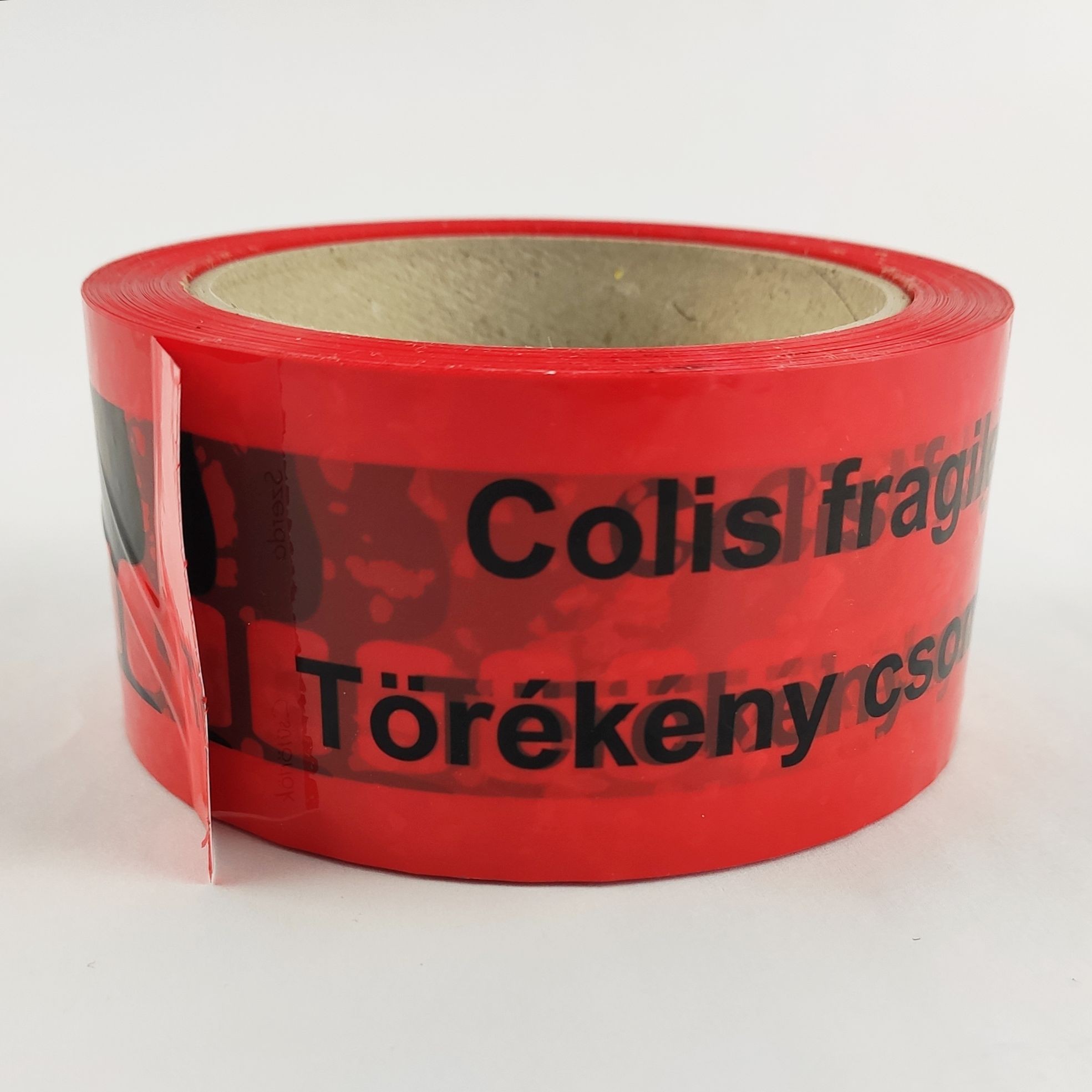 Piros ragasztószalag, csomagolószalag nyomtatott “Törékeny csomag” felirattal,