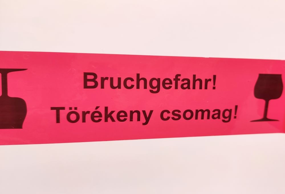 Pohár piktogrammal, valamint a felirat franciául (Colis fragile!) és németül (Bruchgefahr!)