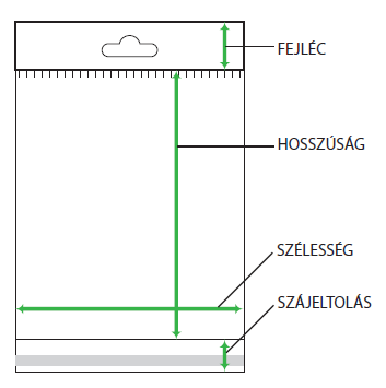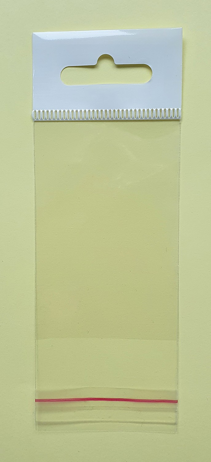 Felakasztható, eurolyukas ragasztócsíkos BOPP (celofánszerű) tasak.