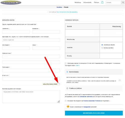 Ha a számlázási címtől eltérő helyre szeretné a szállítást, akkor a Pénztár oldalon, kérjük, pipálja be a Szállítás másik címre felirat melletti rubrikát, (lásd a képet) és megjelennek a postázási cím felviteléhez szükséges mezők.